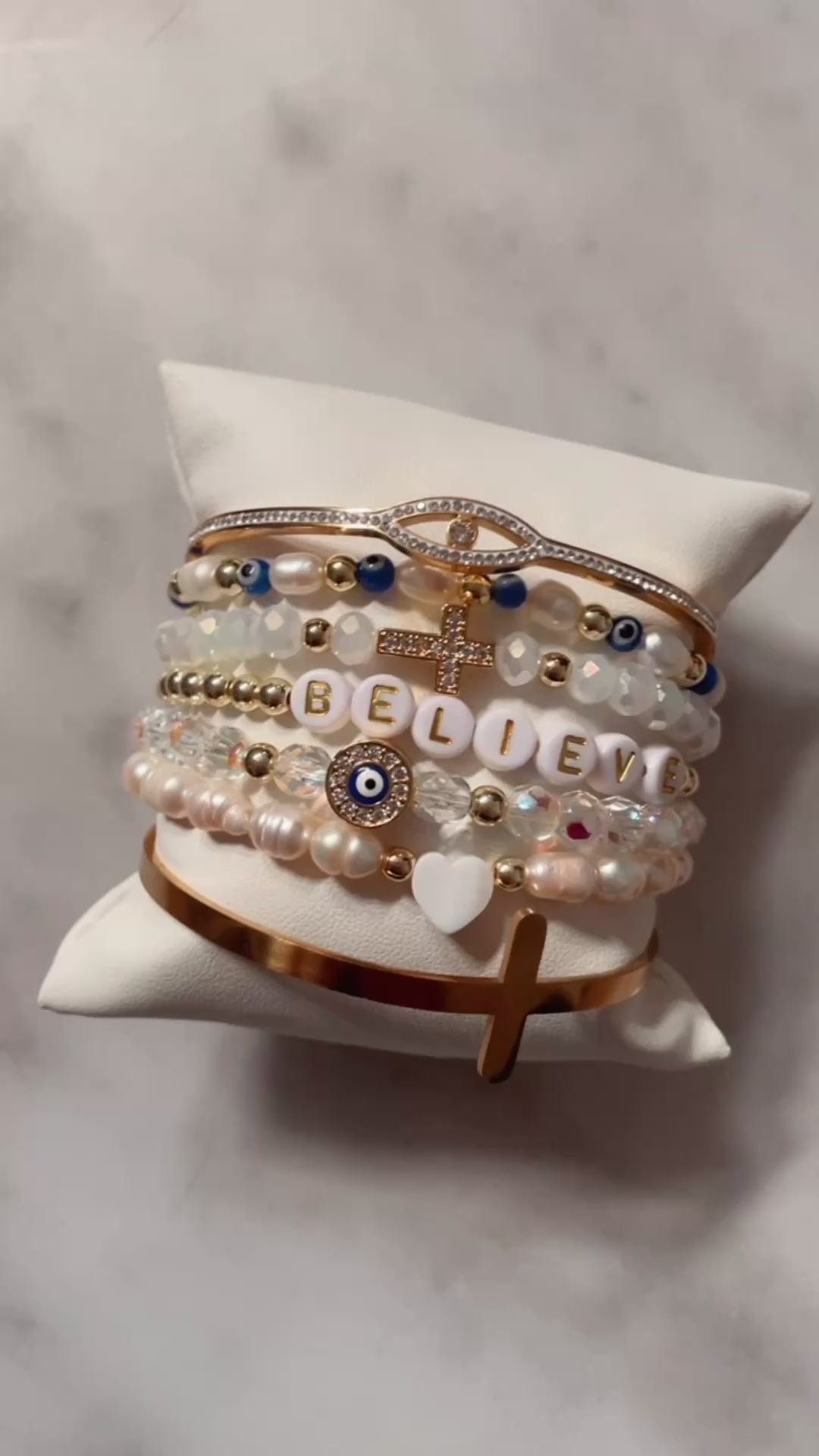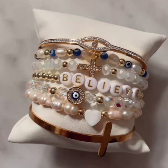 - Believe Cross Bracelet - Cubic zirconia cross on white faceted beads